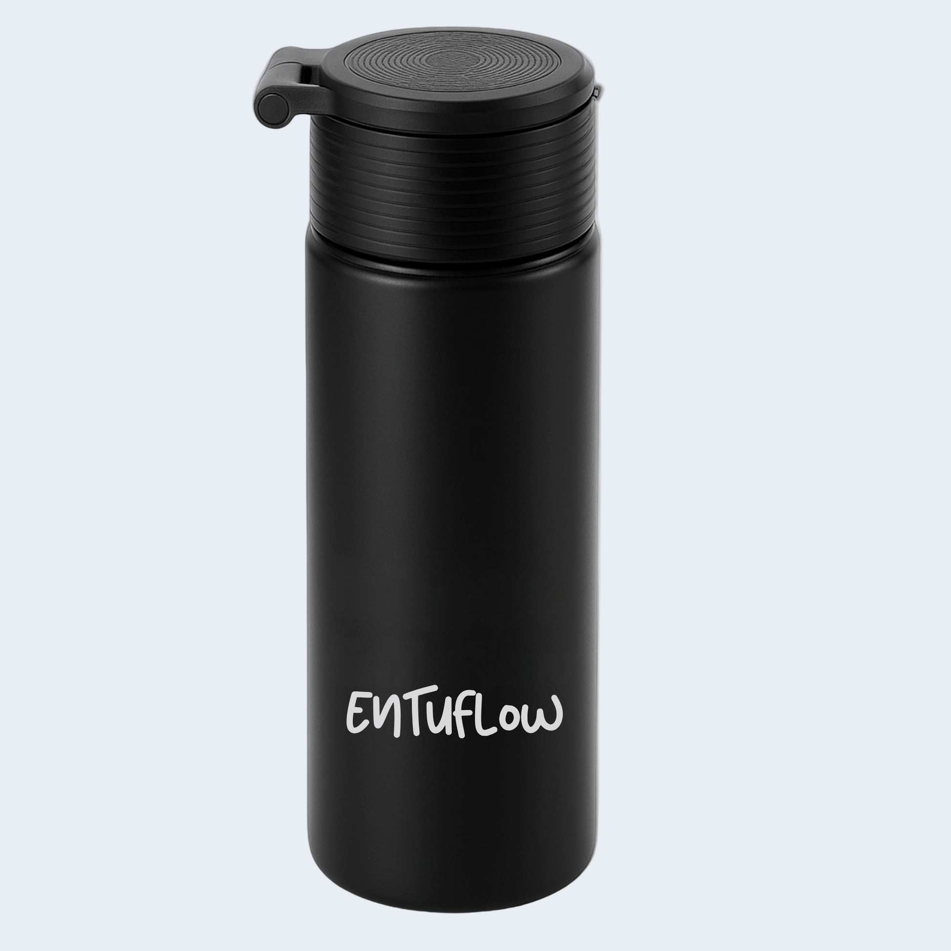 EnTuFlow está fabricado en acero inoxidable con aislamiento térmico, manteniendo las bebidas calientes hasta 12 horas y frías hasta 24 horas.