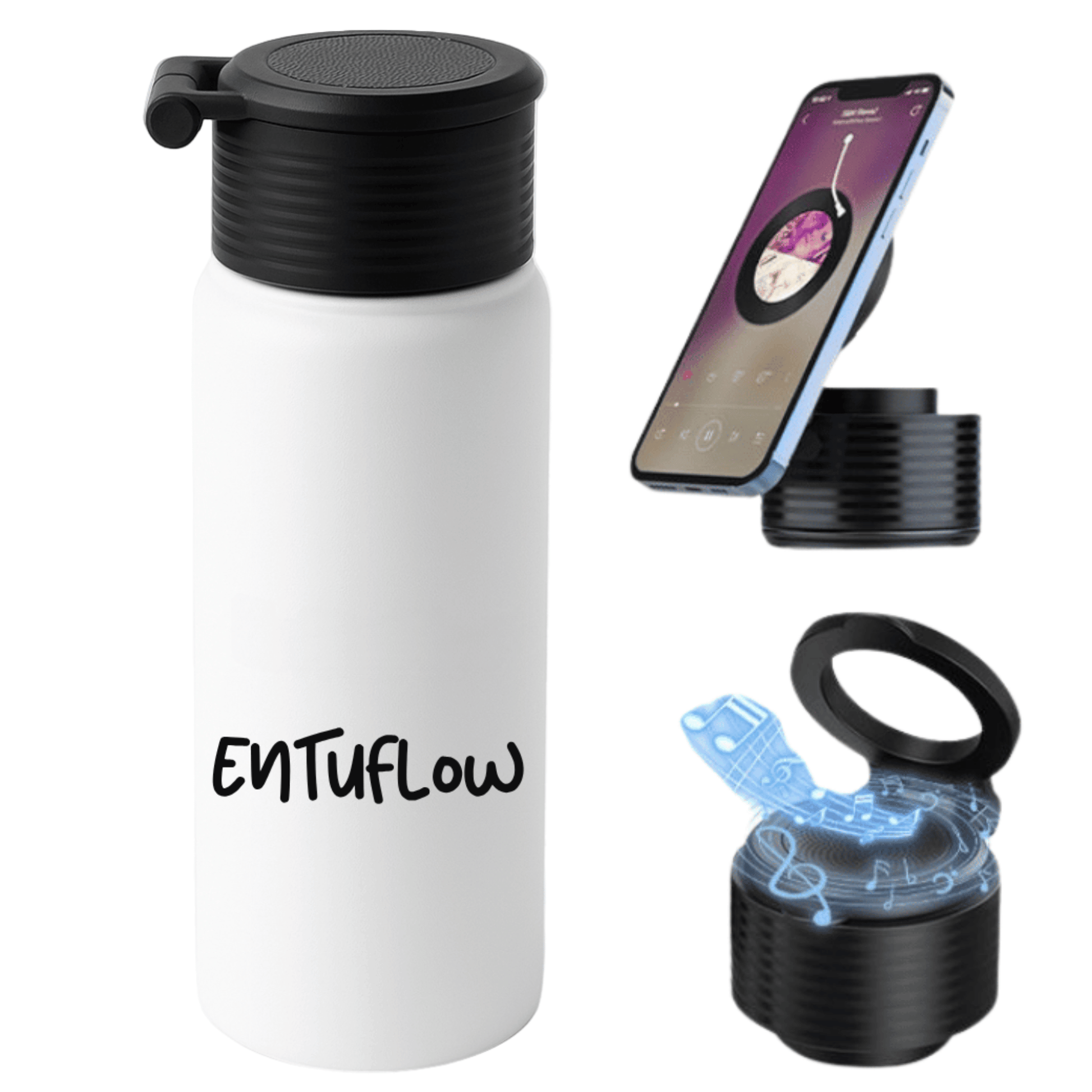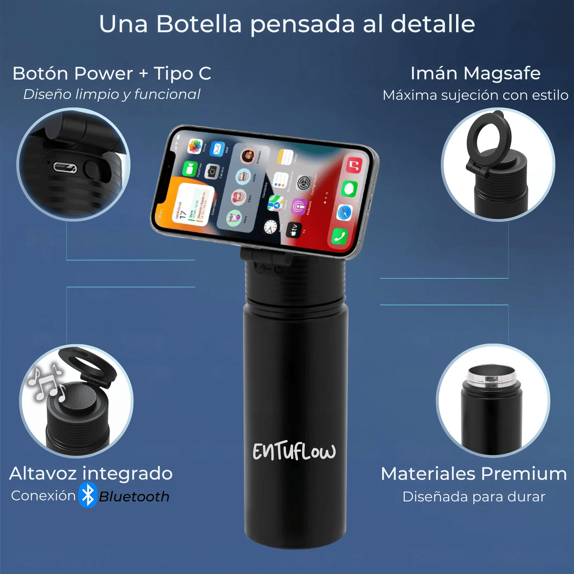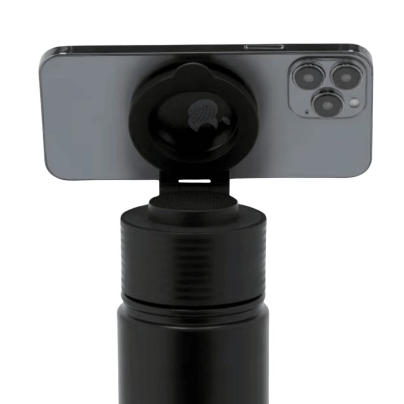 - Diseño 3 en 1: Botella térmica de acero inoxidable con soporte magnético y altavoz integrado con conexión Bluetooth 5.3 para mantener tu teléfono seguro y siempre a la vista. Olvídate del trípode!